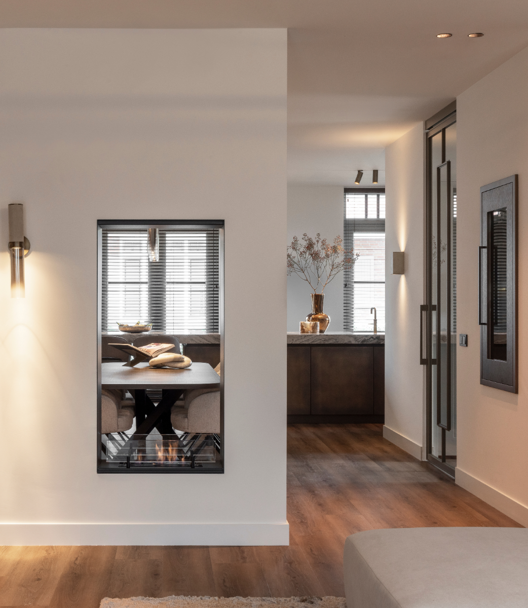 De begane grond en badkamer zijn ontworpen met een stoere, verfijnde uitstraling, waarbij hoogwaardige materialen de hoofdrol spelen. Denk aan prachtig kwartsiet natuursteen, luxe suède leer voor de tv-wand en donkere houtstructuren die een rijke, gelaagde sfeer creëren. Onze taatsdeuren versterken deze esthetiek door een perfecte balans tussen functionaliteit en design, waarbij de bronzen afwerking op subtiele wijze terugkomt in het interieur.